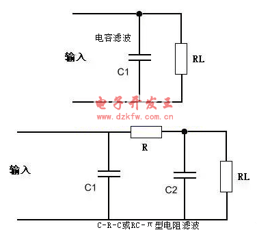 根據電抗性元件對交、直流阻抗的不同,由電容C及電感L所組成的濾波電路的基本形式如圖1所示。因為電容器C對直流開路,對交流阻抗小,(http://m.diks.com.cn/ 電子開發網)所以C并聯在負載兩端。電感器L對直流阻抗小,對交流阻抗大,因此L應與負載串聯。