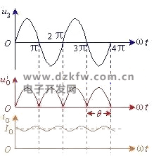 在橋式整流電路中,當u2正半周時,D1、D3導電,電感中的電流將滯后u2不到90°。當u2超過90°后開始下降,電感上的反電勢有助于D1、D3繼續導電。當u2處于負半周時,D2、D4導電,變壓器副邊電壓全部加到D1、D3兩端,致使D1、D3反偏而截止,此時,電感中的電流將經由D2、D4提供。由于橋式電路的對稱性和電感中電流的連續性,四個二極管D1、D3;D2、D4的導電角θ都是180°,這一點與電容濾波電路不同。