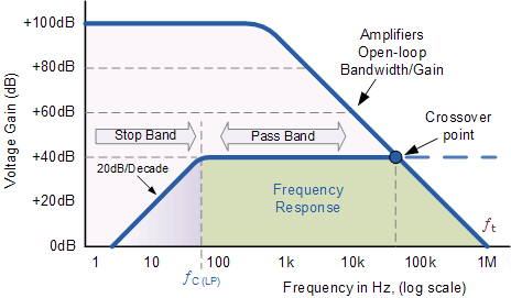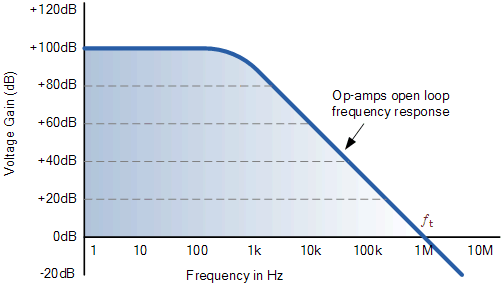 常用的運算放大器如uA741具有典型的“開環”(無任何反饋),最大約100dB的直流電壓增益,在-20dB / Decade的滾降率下降低(-6db / Octave)隨著輸入頻率的增加。 uA741的增益降低,直到達到單位增益(0dB)或其“轉換頻率”(ƒt),大約為1MHz。這使得運算放大器的頻率響應曲線與一階低通濾波器非常相似,如下所示。