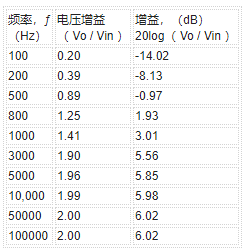 頻率響應波特圖的數據可以通過將上面獲得的值在100Hz到100kHz的頻率范圍內代入電壓增益的公式來獲得: