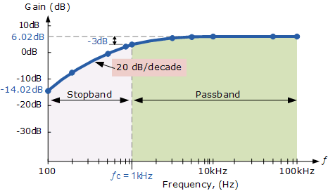 就像低通濾波器一樣,高通有源濾波器的操作可以從上面的頻率增益公式中驗證: