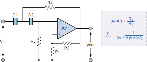 從技術上講,沒有一個有源高通濾波器。與具有“無限”頻率響應的無源高通濾波器不同,有源高通濾波器的最大通帶頻率響應受到所使用的運算放大器的開環特性或帶寬的限制,使它們看起來好像是通過選擇運算放大器和增益確定的高頻截止帶通濾波器。