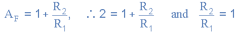 作為電阻值, R 2 除以電阻, R 1 給出一個值。然后,電阻 R 1 必須等于電阻 R 2 ,因為通帶增益 A <子>˚F = 2 。因此,對于兩個反饋電阻,我們可以為兩個電阻選擇合適的值,例如10kΩ。