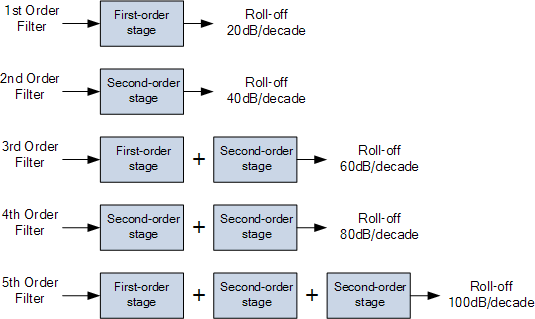 高階高通有源濾波器,例如第三,第四,第五等,只需將第一級和第二級濾波器級聯在一起即可形成。例如,通過級聯一階和二階濾波器形成三階高通濾波器,通過將兩個二階濾波器級聯在一起形成四階高通濾波器,依此類推。