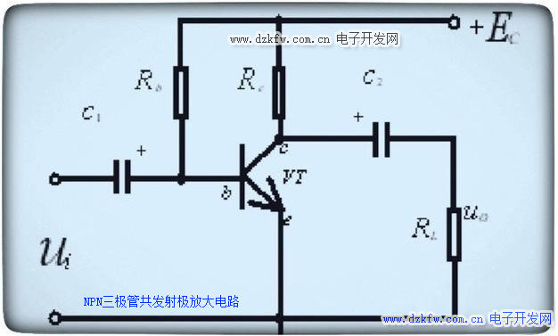上圖是以NPN三極管共發射極放大電路為例的固定偏置電路圖。