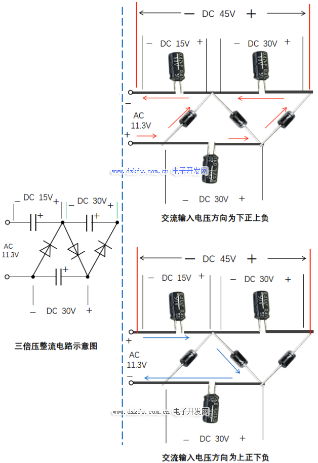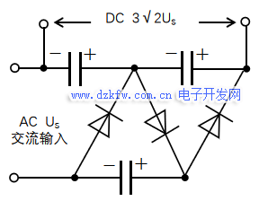 以上就是二倍壓整流電路的詳解,在二倍壓整流電路基礎上,再加一組二極管和電解電容,就組成三倍壓整流電路,如下圖1-6所示。