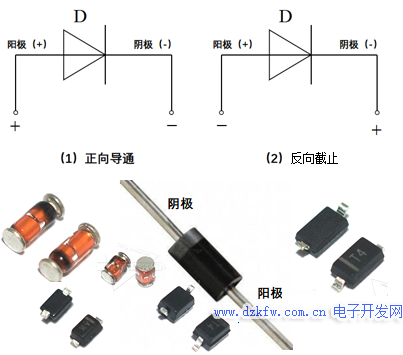 眾所周知,二極管具有單向導電性,如下圖1-3所示。當陽極電位高于陰極電位時正向導通,一旦導通,管壓降保持不變,一般為零點幾伏;當二極管的陽極電位低于陰極電位時反向截止,相當于一個斷開的開關。