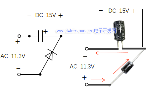 基于二極管的特性,把一個二極管和一個電解電容串接在交流電路上,如下圖1-4所示。設輸入電壓有效值為11.3V,那么這個電壓的峰值約為15.9V(√2×11.3),由于二極管的單向導電性,輸入電壓的方向,只有下正上負時,二極管才能導通,此時電解電容充電;當輸入電壓方向為上正下負時二極管截止,電容不充電,但也不會放電。
