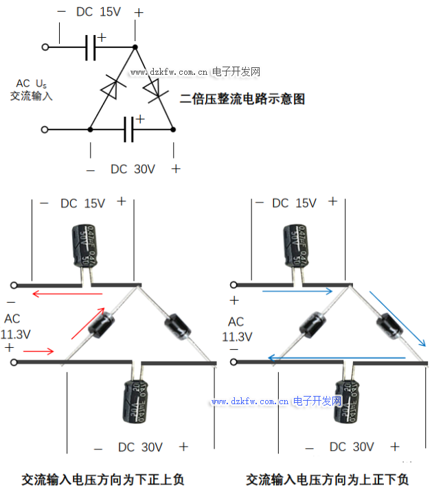 那么問題來了,如果我們想讓輸出電壓升高,又該怎么辦呢?其實方法不一,例如在交流輸入端通過變壓器把電壓升高再整流,或者在整流后的直流端通過斬波電路把電壓升高……而我這次所說的倍壓整流,是區別于以上兩種方法的另一種升壓方式。