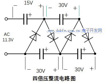 以上就是二倍壓整流電路的詳解,在三倍壓整流電路基礎上,再加一組二極管和電解電容,就組成四倍壓整流電路,如圖1-7所示。依此類推,每增加一組二極管和電容,輸出電壓就可以增大一倍……這就是倍壓整流電路的有趣之處,你覺得呢?