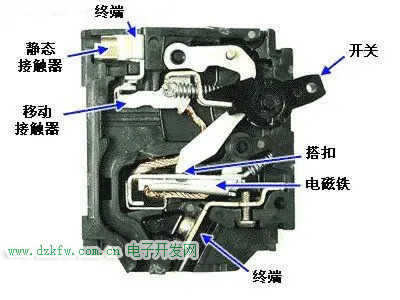 電路中的火線與開關兩端相連。當開關置于接通狀態時,電流從底部終端流出,依次流經電磁體、移動接觸器、靜態接觸器,最終從頂部終端流出。