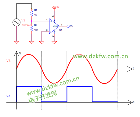 通過分壓電阻將交流信號衰減至比較器正端輸入,當(dāng)交流輸入超過零基準(zhǔn)電壓時,過零檢測電路會改變比較器的輸出狀態(tài)。