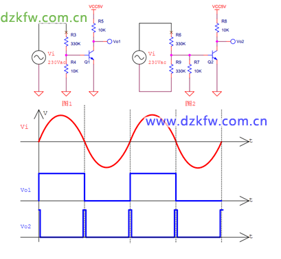 通過分壓電阻將交流信號衰減至三極管基極,利用三極管特性進(jìn)行過零檢測來改變輸出狀態(tài)。
