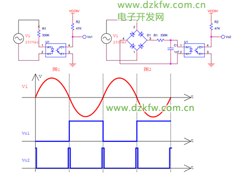 利用二極管導(dǎo)通和光耦隔離特性進(jìn)行過零檢測來改變輸出狀態(tài)。