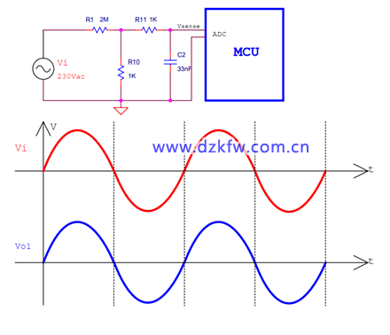 通過分壓電阻將交流信號衰減至ADC輸入端,通過ADC進(jìn)行電壓采樣來檢測過零點。