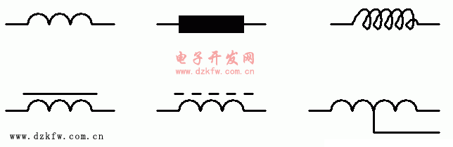 將一段導線繞成螺旋形狀,就做成了一個簡單的電感元件.下面是一些常見的電感圖形.最后一個是帶抽頭的電感,如果電感有磁芯,磁芯是不完全閉合的,這與變壓器不同.黑色那種是國外的畫法,比較少見.實心線代表有磁芯,并且磁芯是導電的如硅鋼片、純鐵等,虛線則為電阻率很大的如鐵氧體等。