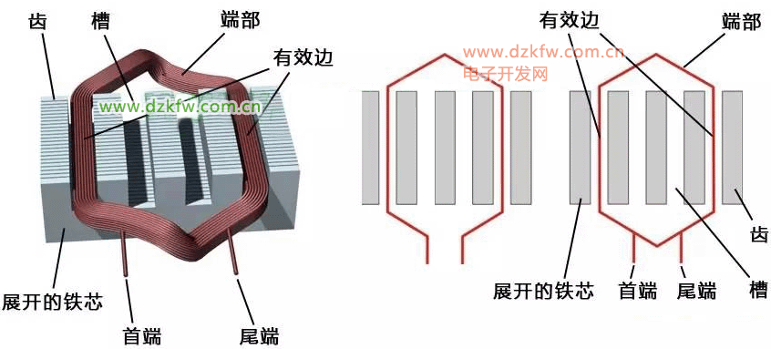 圖2左圖是一截鐵芯上的一個線圈,一個線圈是由多圈導(dǎo)線繞制而成,是多匝線圈,嵌在鐵芯槽內(nèi)的部分稱為有效邊,在鐵芯兩邊的稱為端部,可以理解為線圈的有效邊是參與切割主磁場,是有效部分,而線圈在槽外部分僅起連接有效邊的作用。線圈的兩個線端稱為首端與尾端,本課件中按繞制方向定義首端與尾端。