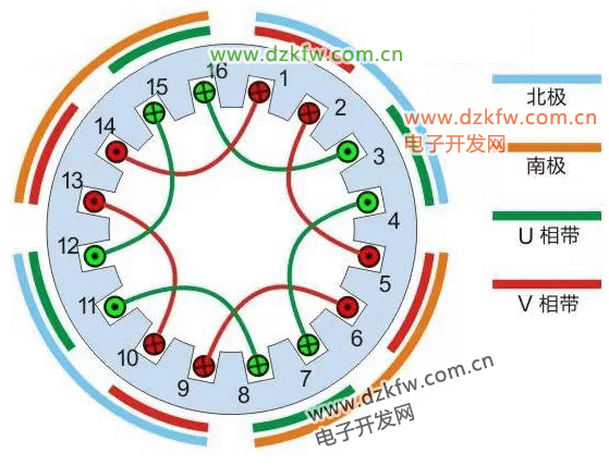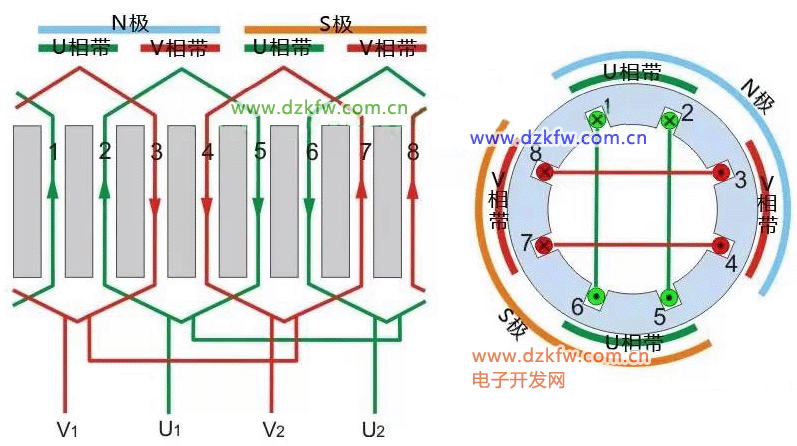 在圖8右圖中右圖是圓形圖,圓形圖較直觀。先分配1號槽至4號槽為北極,分配5號槽至8號槽為南極。在N極(北極)下分配1號槽與2號槽為U相帶,分配3號槽與4號槽為V相帶。在S極(南極)下分配5號槽與6號槽為U相帶,分配7號槽與8號槽為V相帶,見圖中彩色標(biāo)記。