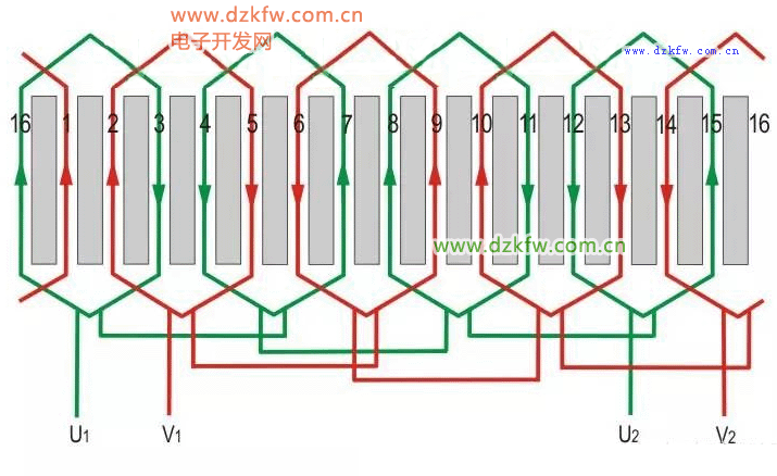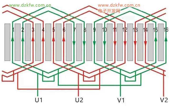 圖11是采用單層同心式繞組的2極16槽電機(jī)圓圖,圖12是采用單層同心式繞組的2極16槽電機(jī)展開圖。