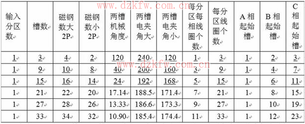 在表中,3槽至33槽,它們只有一個分區,這些電動機都是非力偶電動機。如:表中有9槽8極和9槽10極,有些工廠把它做成分數槽集中繞組無刷電動機,電機只有一個分區,這種電動機生產出來后會帶來震動和噪聲,很難避免。凡是分數槽集中繞組電動機中只有一個分區,這種電動機就是非力偶電動機,就會造成由于力矩不對稱所產生的震動和噪聲。因此必須避免采用一個分區的分數槽集中繞組無刷電動機。應該說9槽8極和9槽10極定子是一樣,只是轉子極數不同,但都是非力偶電動機,運行是不太平穩的。
