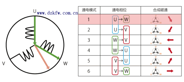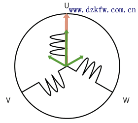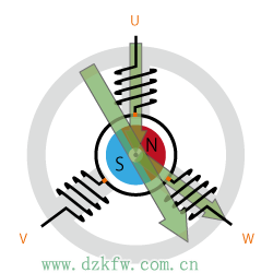 圖2-D:BLDC電機(jī)的轉(zhuǎn)動(dòng)原理從U相向W相通電,可以認(rèn)為產(chǎn)生了兩個(gè)磁通量合成的磁通量
