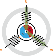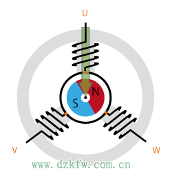 若改變合成磁通量的方向,則永磁體也會(huì)隨之改變。配合永磁體的位置,切換U相、V相、W相中通電的相,以變更合成磁通量的方向。連續(xù)執(zhí)行此操作,則合成磁通量將發(fā)生旋轉(zhuǎn),從而產(chǎn)生磁場(chǎng),轉(zhuǎn)子旋轉(zhuǎn)。