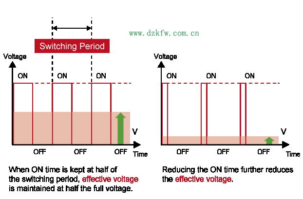 圖5:PWM輸出與輸出電壓的關(guān)系變更某時(shí)間內(nèi)的ON時(shí)間,以變更電壓的有效值。ON時(shí)間越長(zhǎng),有效值越接近施加100%電壓時(shí)(ON時(shí))的電壓
