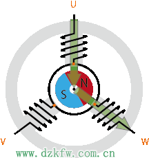 圖2-C:BLDC電機(jī)的轉(zhuǎn)動(dòng)原理從U相向W相通電,則會(huì)產(chǎn)生方向不同的2個(gè)磁通量