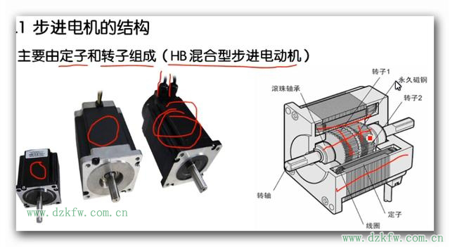 我們從左往右看啊,第一個小的,接著大的,右邊這個有兩股線的它是帶編碼器的,它是可以進行閉環控制的。我們最右邊的是步進電機的立體圖,有了這個立體圖呢就便于大家了解它的真式結構,它上面呢有定子、轉子(轉子上面有磁鋼有齒牙)、線圈、這個就是我們的混合式的步進電動機,現在是我們用的最廣泛的步進電機。大家再看一下下面是一個拆開的步進電機,這個比較直觀,如圖2: