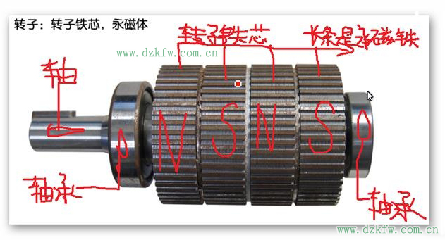 只要我們一通電,這邊就是S極,另一邊呢就是N極,如果把線接反了,那么它的磁極也會跟著就反過來了,所以,這個混合式步進電機它的通電的方式是:來回改變的。大家有機會可以去找一個壞的步進電機自己動手去拆開來看一下,它接出來有8根線,它是兩個線圈連在一起接出來兩根線(也就是說,它是把兩個線圈串接起來形成一個線圈),我在這個圖上面已經給大家標出來了,8個線圈就形成了4個線圈,那么問題來了,我就知道有人會問?你把人家的8個線圈改變成了4個線圈,那我可不可以把它變成兩(2)個線圈呀?當然可以,我們把4個線圈接在一起,采用并勵接法或串勵接法,還有的人還是問,那可不可以把兩個線圈接成一個線圈呢?我的回答是可以的,那樣你的老板就叫你明天不用來上班了!所以大家在接線的時候一定要注意千萬不要把線接錯了。下面呢,我們再看一下轉子,如圖5: