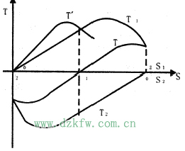 正常運轉(zhuǎn)的伺服電動機,只要失去控制電壓,電機立即停止運轉(zhuǎn)。當伺服電動機失去控制電壓后,它處于單相運行狀態(tài),由于轉(zhuǎn)子電阻大,定子中兩個相反方向旋轉(zhuǎn)的旋轉(zhuǎn)磁場與轉(zhuǎn)子作用所產(chǎn)生的兩個轉(zhuǎn)矩特性(T1-S1、T2-S2 曲線)以及合成轉(zhuǎn)矩特性(T-S 曲線)如圖4 所示,與普通的單相異步電動機的轉(zhuǎn)矩特性(圖中T′-S 曲線)不同。這時的合成轉(zhuǎn)矩T 是制動轉(zhuǎn)矩,從而使電動機迅速停止運轉(zhuǎn)。