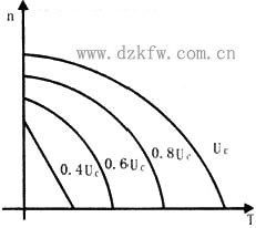 圖5 是伺服電動機單相運行時的機械特性曲線。負載一定時,控制電壓Uc 愈高,轉(zhuǎn)速也愈高,在控制電壓一定時,負載增加,轉(zhuǎn)速下降。
