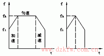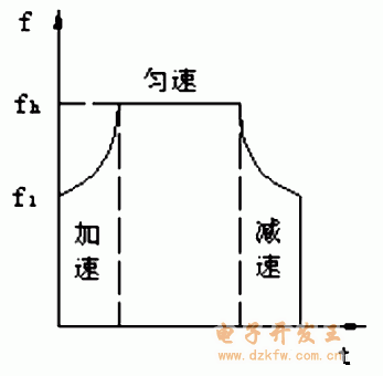 為了充分發揮電機的快速性能,通常使電機在低于啟動頻率下啟動,然后逐步增加脈沖頻率直到所希望的速度,所選擇的變化速率要保證電機不發生失步,并盡量縮短啟動加速時間。為了保證電機的定位精度,在停止以前必須使電機從最高速度逐步減小脈沖率降到能夠停止的速度(等于或稍大于啟動速度)。因此,步進電機拖動負載高速移動一定距離并精確定位時,一般來說都應包括“啟動-加速-高速運行(勻速)-減速-停止”五個階段,速度特性通常為梯形,如果移動的距離很短則為三角形速度特性,如圖1所示。