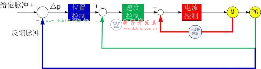 輸入信號/命令可以是位置、速度、扭矩等控制信號,對應(yīng)伺服電機(jī)的三種控制模式,每種控制模式都對應(yīng)著環(huán)的控制,扭矩控制是電流閉環(huán)控制,速度模式是速度閉環(huán)控制,位置模式則是三閉環(huán)控制模式(扭矩、速度、位置)。下面我們對位置模式的三閉環(huán)進(jìn)行分析: