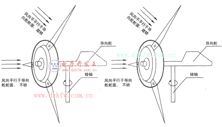 可直接充當發電機使用,此時輸出的就是直流電,但轉子旋轉的方向不同,則輸出電壓的正負極性也會相反,為了使發電機輸出電壓的極性保持恒定,可在電壓的輸出端加接一個橋式整流電路,這樣無論發電機輸出的極性如何,均可保證輸出端的極性始終恒定,如上圖所示。為了使發電機輸出盡可能多的電能,應使葉片正對風向,制作時可在風力發電機的尾部加裝一個導向舵(如下圖所示),若風力發電機未能正對風向,則導向舵舵面二側受力不等,其中對風的一側受力大,背風的一側受力小,同時由于導向舵的受風面較大,在風力的作用下會使整個風力發電機產生轉動,直至導向舵平面與風向平行,舵面二側受力均等,當然此時風力發電機的葉片剛好正對風向,槳葉受風面最大,確保了發電機輸出的電壓最大,輸出電能的效率也最高。由于風力的大小往往并不恒定,同時根據所選用直流有刷電機的不同電壓等級,如24V、36V、48V等,電機輸出的電壓會有所不同,實際應用中要以測量到的輸出電壓為準。因為改裝選用的是電動自行車的廢舊電動機,有些電機可能會有不同程度的損壞,根據筆者改裝的經驗,直流有刷電動機繞組線圈較少出現問題,絕大部分是電刷和換向器損壞,因為電刷和換向器工作時處于摩擦狀態,長期工作后,電刷會磨損,換向器會出現燒蝕,污損等現象,如果換向器燒蝕不嚴重,可用細砂紙打磨換向器并更換電刷即可正常工作,如果電刷,換向器磨損嚴重無法修復,這時干脆去掉電刷,不用電刷,斷開換向器上任意一處,引出兩根線作為輸出線,即可使用,不過這時輸出的電流不再是直流而是交流,其頻率、電壓會隨著電機旋轉的的速度變化而變化,但經整流、濾波后,即可變為較平穩的直流電。