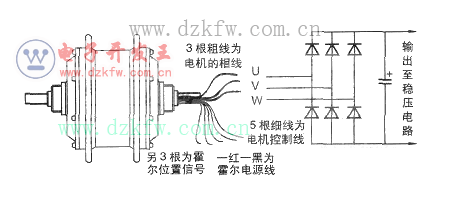 直流無刷電機的改裝要簡單得多,只要從輸出的8根線中找出繞組線圈的3根引線即可,通常輸出的8根線中有5根細線,其中一紅一黑2根線是霍爾位置傳感器的電源輸入線;另3根是霍爾位置傳感器的信號輸出線,控制電子開關適時為3個繞組線圈提供電源,產生旋轉磁場,驅動電機轉動,這五根線在改裝中沒有作用,可包好接頭放在一邊,無需理會。另3根粗線即是我們需要的繞組線圈輸出線,直流無刷電機的三相繞組線圈采用星形連接,當轉子磁鋼旋轉時,繞組線圈輸出的是三相交流電。