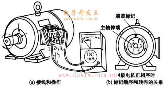 在不通電的情況下,可用下述方法確定一臺三相異步電動機的出線相序或轉向。下述操作和4極電動機實例參見圖一。