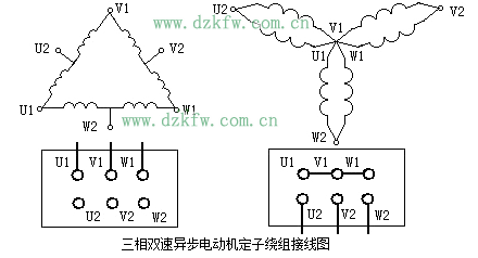 圖(a)為雙速異步電動定子繞組的△接法,三相繞組的接線端子U1、V1、W1與電源線連接,U2、V2、W2三個接線端懸空,三相定子繞組接成△形。