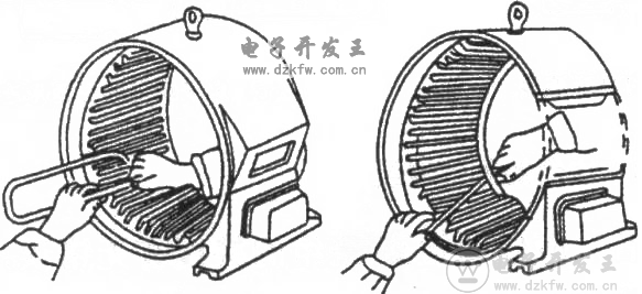為使線圈嵌得整齊,進槽前先用右手把要嵌的一條線捏扁,同時左桿捏住線圈的下端,向相反方向扭轉,使線圈的槽外部分略帶扭絞形,捏扁后的線圈放到槽口槽絕緣中間(并先放一層引槽紙),左手捏住線圈朝里拉入槽內,剩余導線可用劃線板依劃入槽內,在下線過程中,必須小心謹慎,用力適當,勿損傷絕緣,保持槽內導線整齊平行不相交,槽內絕緣不要偏移,以防導線拐角處碰鐵。
