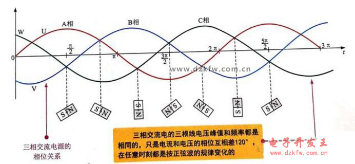 如果在這個(gè)線圈通入的是交流電的,可以看到由于電源的不斷變化,這個(gè)磁場(chǎng)也隨之不斷變化,變化的頻率和電源頻率有關(guān)。不過這個(gè)變化的磁場(chǎng)是垂直變化的,接下來我們接入三根線圈,線圈夾角互為120⁰,通入三相交流電,三相電源的相位角也是120⁰度,這樣三個(gè)線圈產(chǎn)生的磁場(chǎng)疊加,正好是一個(gè)旋轉(zhuǎn)的磁場(chǎng)。