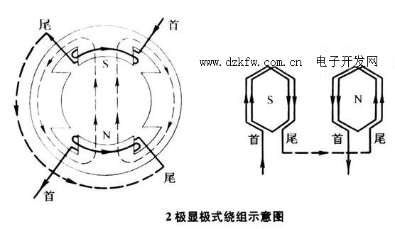 不同的布線和接線方式可以形成不同的極性,電動機定子繞組根據磁極數與繞組分布形成實際磁極數的關系,可分為顯極式與庶極式兩種類型,也稱為全極式和半極式。在倍極比雙速電動機中,就是通過變換繞組顯極式和庶極式接法來變速的。