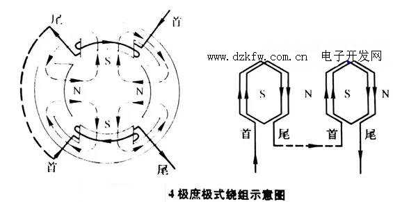 庶極式繞組中,每個線圈(組)所形成的磁極的極性都相同,如都是S極,由于同極性相斥的原理,使線圈形成的磁場經相鄰極返回構成閉合磁路,從而使沒有線圈的凸極上產生異極性N磁極。因而所有線圈(組)里的電流方向都相同,即相鄰兩個線圈(組)的連接方式應該是順接串聯,即首端接尾端、尾端接首端,俗稱“頭接尾”、“尾接頭”。