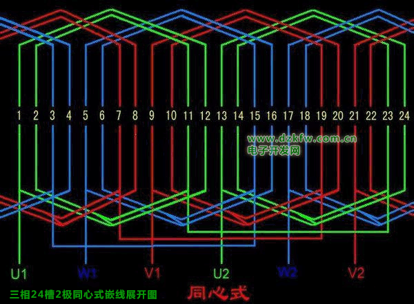 三相24槽2極同心式嵌線展開(kāi)圖:
