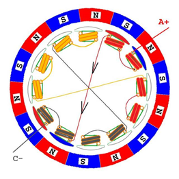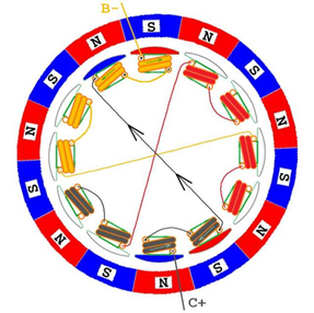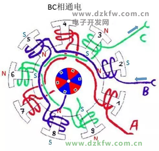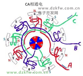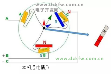 當AB相通電,則A極線圈產生的磁感線方向如紅色箭頭所示,B極產生的磁感線方向如圖藍色箭頭所示,那么產生的合力方向即為綠色箭頭所示,那么假設其中有一個二極磁鐵,則根據“中間的轉子會盡量使自己內部的磁感線方向與外磁感線方向保持一致”則N極方向會與綠色箭頭所示方向重合。至于C,暫時沒他什么事。 第二階段:AC相通電