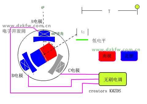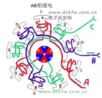 上圖顯示了定子繞組的聯結方式(轉子未畫出假想是個二極磁鐵),三個繞組通過中心的連接點以“Y”型的方式被聯結在一起。整個電機就引出三根線A, B, C。當它們之間兩兩通電時,有6種情況,分別是AB, AC, BC, BA, CA, CB注意這是有順序的。 下面我看第一階段:AB相通電