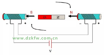 狀態1 當兩頭的線圈通上電流時,根據右手螺旋定則,會產生方向指向右的外加磁感應強度B(如粗箭頭方向所示),而中間的轉子會盡量使自己內部的磁感線方向與外磁感線方向保持一致,以形成一個最短閉合磁力線回路,這樣內轉子就會按順時針方向旋轉了。 當轉子磁場方向與外部磁場方向垂直時,轉子所受的轉動力矩最大。注意這里說的是“力矩”最大,而不是“力”最大。誠然,在轉子磁場與外部磁場方向一致時,轉子所受磁力最大,但此時轉子呈水平狀態,力臂為0,當然也就不會轉動了。補充一句,力矩是力與力臂的乘積。其中一個為零,乘積就為零了。 當轉子轉到水平位置時,雖然不再受到轉動力矩的作用,但由于慣性原因,還會繼續順時針轉動,這時若改變兩頭螺線管的電流方向,如下圖所示,轉子就會繼續順時針向前轉動,