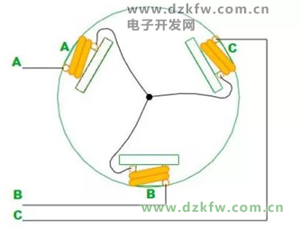 狀態2 如此不斷改變兩頭螺線管的電流方向,內轉子就會不停轉起來了。改變電流方向的這一動作,就叫做換相。補充一句:何時換相只與轉子的位置有關,而與其他任何量無直接關系。 第二部分:三相二極內轉子電機 一般來說,定子的三相繞組有星形聯結方式和三角聯結方式,而“三相星形聯結的二二導通方式”最為常用,這里就用該模型來做個簡單分析。
