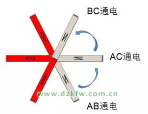 要說明一下的是,由于每根引出線同時接入兩個繞組,所以電流是分兩路走的。這里為使問題盡量簡單化,下面幾個圖中只畫出了主要一路的電流方向,還有一路電流未畫出,另一路電流的具體情況放在后面進行分析,涉及到電路檢測換相位置。