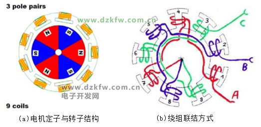 六個過程即完成了完整的轉動,其中6次換相 第三部分:三相多繞組多極內轉子電機 我們再來看一個復雜點的,圖(a)是一個三相九繞組六極(三對極)內轉子電機,它的繞組連線方式見圖 (b)。從圖(b)可見,其三相繞組也是在中間點連接在一起的,也屬于星形聯結方式。一般而言,電機的繞組數量都和永磁極的數量是不一致的(比如用9繞組6極,而不是6繞組6極),這樣是為了防止定子的齒與轉子的磁鋼相吸對齊。