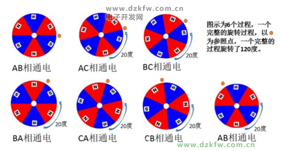 以上為六個不同的通電狀態,其中經歷了五個轉動過程。每個過程為20度。